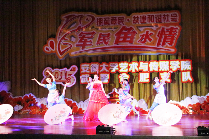 签约仪式后,学院师生和武警官兵在武警合肥市支队礼堂共同奉献了一台“军民鱼水情”的精彩演出。武警合肥市支队支队长周文才大校,政治委员束从国大校,以及近1000名武警官兵观看了演出。