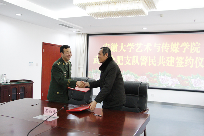 张再舟和胡献平分别讲话,他们指出,武警合肥市支队与安徽大学艺术与传媒学院签订共建协议,这是一件大好事,标志着两个单位的友好关系又揭开了新的一页,对于武警合肥市支队和学院的社会主义精神文明建设,巩固和发展警民团结的大好局面,共建和谐校园、和谐警营将起到很大的推动作用。他们表示,发挥好军地双方教育资源优势,深化共建内涵,在精神文明共建、国防教育、军地人才培养、双拥活动及日常工作等方面相互支持、相互联系、资源共享、优势互补、共同发展。相信在武警官兵和学院师生的共同努力下,警民共建之花一定会开得更加鲜艳。