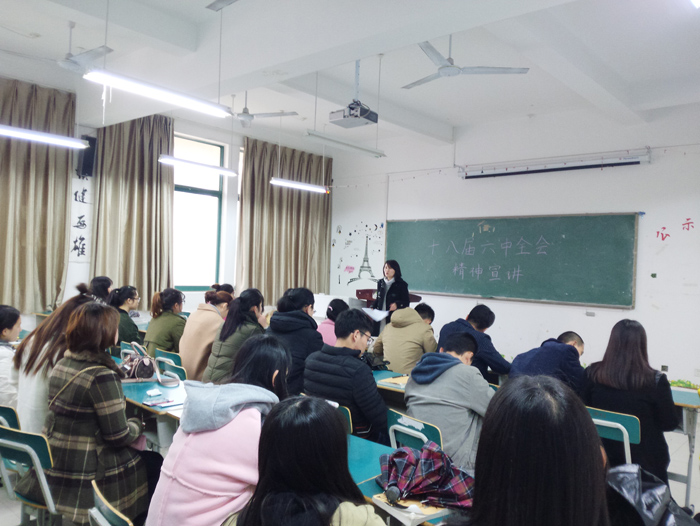 党的十八届六中全会公报发布后,按照学院党委部署,近日新闻播音系学生党支部积极响应精神号召,积极组织安排,为在校学生们“零距离”解读十八届六中全会精神。根据分工安排新闻播音系党总支副书记张志云老师、系学生党支部书记穆雨老师,系学生党支部组织委员陈伟伟老师分别进入新闻播音系16级广播电视学和播音主持三个班级,对100名学生进行了十八届六中全会精神宣讲。