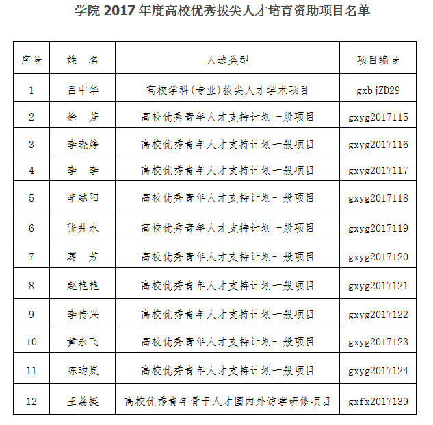 根据《安徽省教育厅关于做好2017年度高校优秀拔尖人才培育项目立项的通知》,我院1位教师入选高校学科(专业)拔尖人才学术资助项目,10位教师入选高校优秀青年人才支持计划(一般项目),1位教师入选高校青年骨干人才国内外访学研修项目。