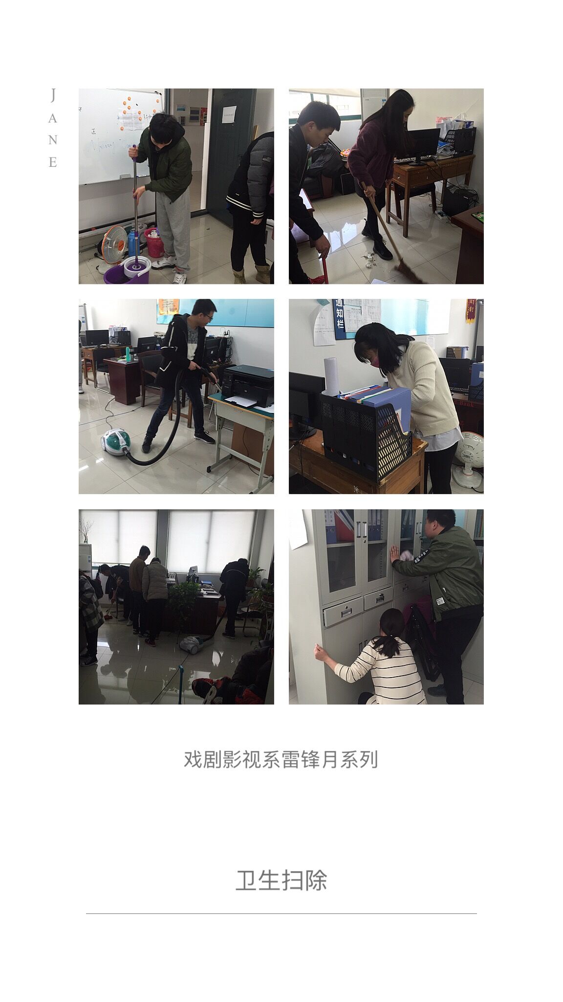 3月16日中午十二点,戏剧影视系团总支全体成员、学生会全体成员、各班班干部、入党积极分子和部分志愿者们在一教四楼开展学雷锋精神义务劳动活动。