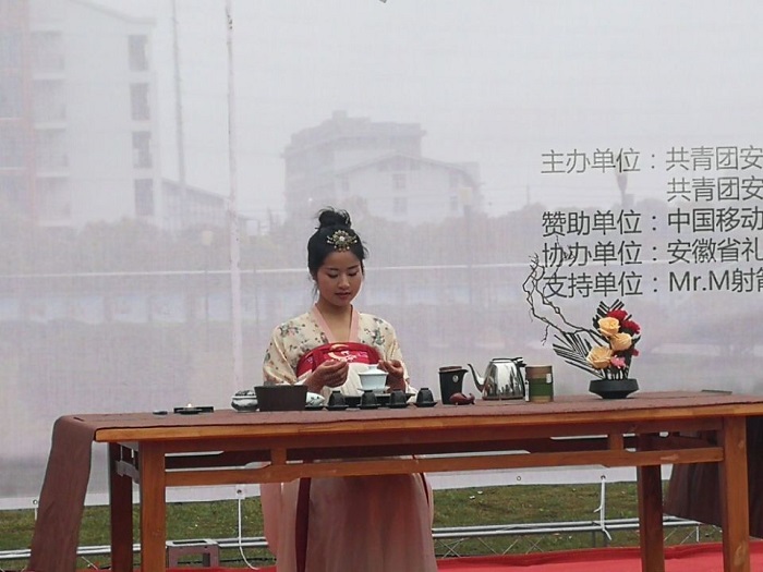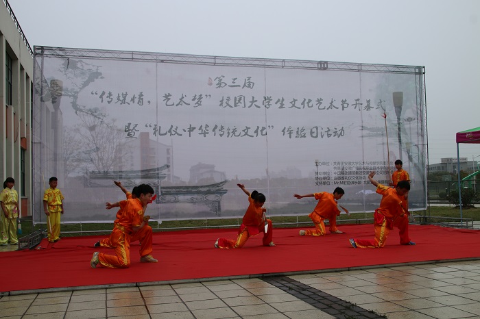 开幕式上,模特协会的同学们带来的旗袍秀仪态优雅,向大家展示着中华传统服饰的美;特邀的安徽省体育局武术队带来了精心编排的刀、剑、枪、棍和拳术表演,专业的真功夫和潇洒的身姿,赢得了台下的阵阵掌声;古风朗诵《短歌行》演绎了建安文学的风骨;戏曲折扇《梨花颂》展示了戏曲魅力;特邀的茶道表演《醉是一杯江南绿》展示了专业的茶艺流程和雅致的茶道文化,耐人寻味。