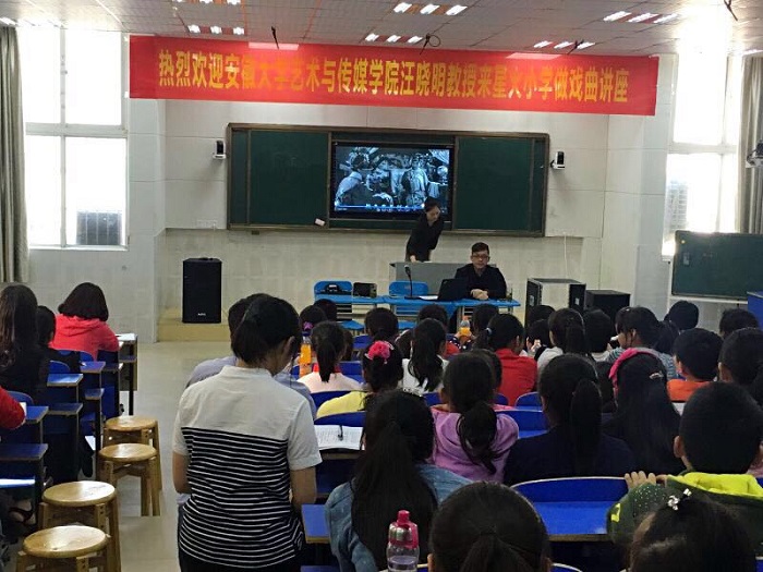 为了弘扬中国传统文化,贯彻“戏曲进校园”这一举措。安徽大学艺术与传媒学院戏剧影视系受邀前往合肥市星火小学进行戏曲知识讲座。4月18日下午,由戏剧影视系副主任李伟教授带队,国家一级演员汪晓明以及黄梅班学生方钰蕾开展戏曲知识讲座。