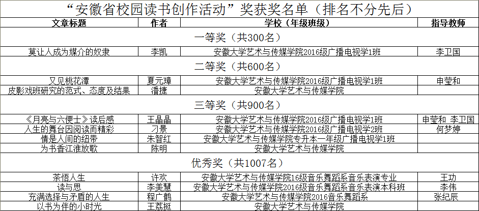 根据省委教育工委、省教育厅、省文化厅、省新闻出版广电局、团省委《关于印发安徽省校园读书创作活动方案的通知》(皖教工委〔2017〕13号)精神,安徽省第一届校园读书创作活动已圆满落幕。我院在此次校园读书创作活动中取得优异成绩,现将获奖名单予以公布。希望获奖的同学和老师再接再厉,再创佳绩!