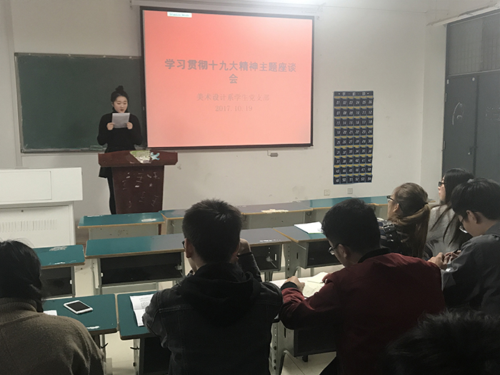10月19日下午,美术设计系学生党支部召开认真学习贯彻十九大精神主题座谈会,会议在2教203举行,由美术设计系学生党支部书记薛如冰同志主持,学生支部全体党员参加会议。