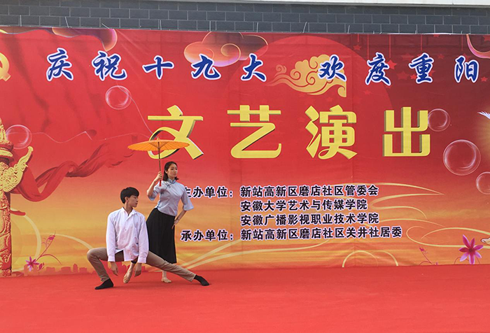 为庆祝党的十九大胜利召开,深入学习宣传贯彻十九大精神,展现新站高新区良好的发展面貌,引领艺术专业学生积极践行马克思主义文艺观,10月26日,学院和新站高新区磨店社区管委会联合举办了以“庆祝十九大 欢度重阳节”为主题的文艺演出活动。