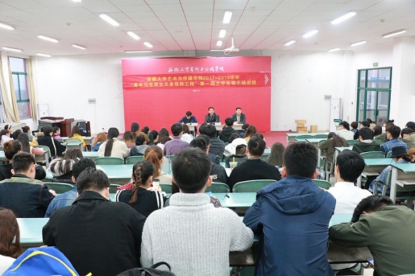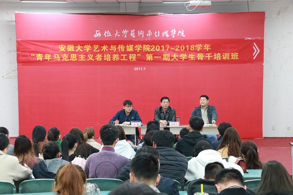 11月14日下午4:40,安徽大学艺术与传媒学院2017-2018学年"青年马克思主义者培养工程"开班典礼,在一教二楼阶梯教室举行。学院关心下一代委员会常务副主任赵枞安,院团委书记陈明,院团委老师孙鑫出席本次开班典礼。