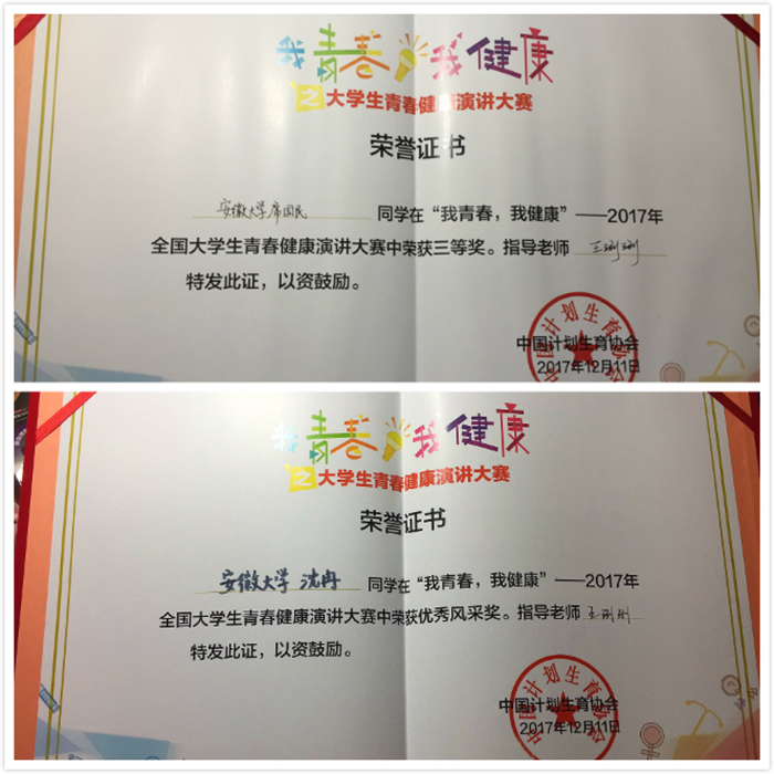 近日,“我青春,我健康”大学生青春健康演讲比赛全国复赛和总决赛在北京举行。进入全国复赛的66名省级预选赛优胜选手同场竞技,我院新闻播音系席国民和沈冉两名同学代表安徽省参赛,分别荣获全国三等奖和优秀风采奖。