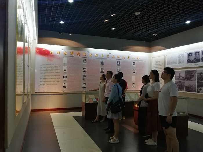 上午10时许,支部党员参观了位于铜陵市铜官区西湖镇朝山村的新四军抗战史迹陈列馆。该陈列馆是铜陵市干部教育培训革命传统教育实践基地、安徽省第四届爱国主义教育基地、安徽省领导干部党史教育基地、安徽省廉政教育基地。展馆内设置了抗日战争时期铜陵地形沙盘,展出图表、照片、宣传画百余幅,新四军臂章、军装、枪炮子弹、党史军史资料图书近50件,集中展示了新四军在铜抗日的光辉历史。在展馆内的党旗前,党员同志们面向鲜红的党旗,高举右手,重温了入党誓词。同志们字字铿锵,用慷慨坚定的誓言表达着自己立志为党和人民全心奉献的信念与决心。