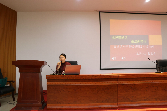 讲座伊始,王老师通过播放两段优秀的文学作品,向大家展示了说好普通话的魅力所在,随即引出了普通话的由来转变、普通话词汇语法标准和普通话水平测试的意义。在介绍普通话测试的评价体系和测试流程时,王老师细致分析了普通话“三级六等”的量化标准,以及“读单音节字词”、“读多音节词语”、“朗读短文”和“命题说话”的注意事项和要求。