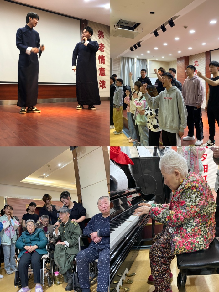 在养老院活动中心,同学们分工明确,陪老人们聊天,表演节目,分发慰问品。戏剧社、黄梅班的同学们发挥自己专业特色分别表演了相声、小品以及黄梅戏,并和老人们一起热情互动,老人们也唱起了歌谣、朗诵了诗歌。一时间,敬老院内人声鼎沸,热闹非凡,充满了欢歌笑语。