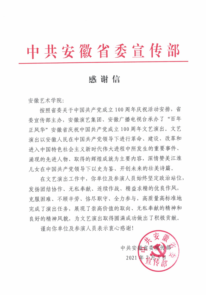 7月5日,安徽省委宣传部寄来感谢信,对我校及参演师生为“百年正风华”文艺演出取得圆满成功做出的积极贡献表示感谢。感谢信中表示,我校及参演师生始终坚定政治站位, 发扬团结协作、无私奉献、连续作战、精益求精的优良作风,克服困难、不顾辛劳、恪尽职守、全力参与,高质量高标准地完成了演出任务,展现了崇高价值的取向、无私奉献的精神和良好的精神风貌。