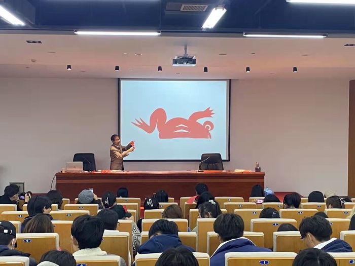 活动开始,葛庭友向同学们介绍了剪纸艺术的发展历史、艺术特点及剪纸方法,让同学们深深感受到了剪纸艺术的魅力。活动期间,葛庭友还现场进行了剪纸展示,一件件栩栩如生的作品跃然而出,引得师生们兴趣盎然,争相观摩,精美的刀工令在场师生大为称赞。