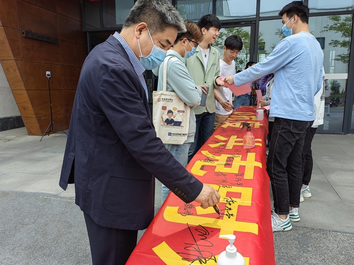 4月20日中午,戏剧影视系党总支主办的“艺心抗疫 共克时艰”主题签名活动在戏剧楼前举行。校党委委员、副校长柳友荣出席活动并带头在倡议横幅上签名。