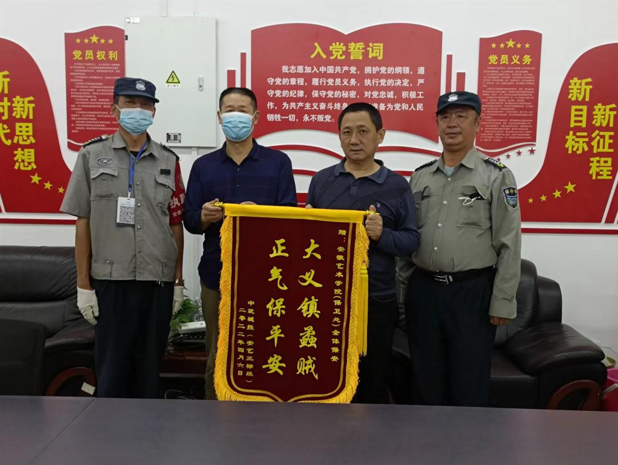 近日,施工单位负责人将绣有“大义镇蟊贼 正气保平安”字样的锦旗送至保卫处,对安保人员的辛勤工作表示感谢。保卫处处长陈雪峰接受锦旗。