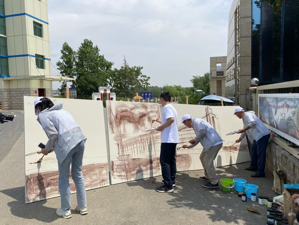 “深扎王家坝”小分队两度在淮河岸线踩点,停停走走,依照不同绘制手法的取景需要,精选王家坝闸下、西田坡庄台等写生点。小分队还深入当地集市拍摄记录,采集创作人物肖像的素材。写生时,单是将12块1.3m*1.5m的画板搬到写生点,已是汗流浃背。持续一天的创作中,师生们不仅要忍耐高温,偶尔袭来的大风还会吹倒画架、田间的飞虫也不时侵扰创作……“写生时心里只想着完美呈现作品,完全意识不到时间过去那么久。”直到三点多才吃上的美术设计系副主任李李在树荫下匆忙扒了几口饭菜又回到了画架前。