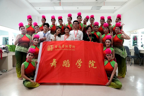 此次活动由舞蹈学院副院长李玉煜,舞蹈学院教师由曦、时特和吴艺璇带队,从教室排练到舞蹈呈现都非常顺利。舞蹈作品《花落花开》由21位舞蹈表演专业在校生共同完成。舞台上,同学们手持扇、头戴花,在伞头的带领下演绎着安徽花鼓灯的舞蹈魅力。出色的表演获得现场观众的一致好评。