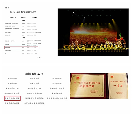 近日,共青团安徽省委通报第五届全省优秀微团课及第一届全省优秀艺术团课评选结果,我校选送的舞蹈《希望的田野》获一等奖,校团委荣获优秀组织奖。