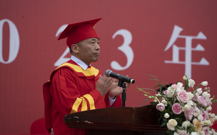 2023届毕业生依次登台,庄重地接受拨穗正冠。学生代表、教师代表、家长代表、行政及后勤管理人员代表分别发言,表达对未来的美好期望,对莘莘学子的殷切祝愿。