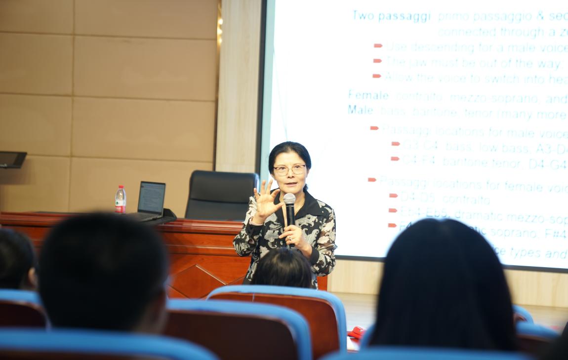 张雯教授全程以中英文双语进行讲解,结合自己数十年教学和表演经验,从声乐教师和声乐演员的职业规划、声乐学科重点知识内容、声乐演唱技巧等方面进行讲解,为师生们带来了一场具有国际水准的学术讲座。期间,师生们与张雯进行充分的互动和交流,张雯分享了自己的见解和经验。