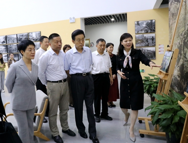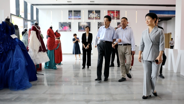 谢广祥一行先后观看设计学院“礼敬中华传统文化”手工劳动坊艺术展、传媒学院张崇岫抗美援朝战地摄影展、音乐学院安博开户中国有限公司管乐团演奏的乐曲《蓝色山脉传奇》。