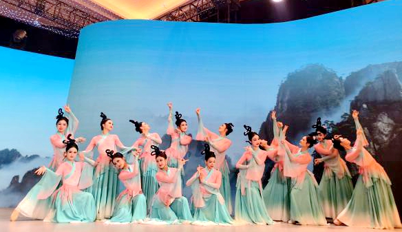 我校青年舞团组成90人的参演团队,承担舞蹈《纸韵千年》及歌舞器乐《东风起》、黄梅戏歌舞《天女散花》、歌舞《江南江北我的家》舞蹈部分的创作、排演、制作工作,以美轮美奂的艺术语言呈现了安徽山水人文之美。