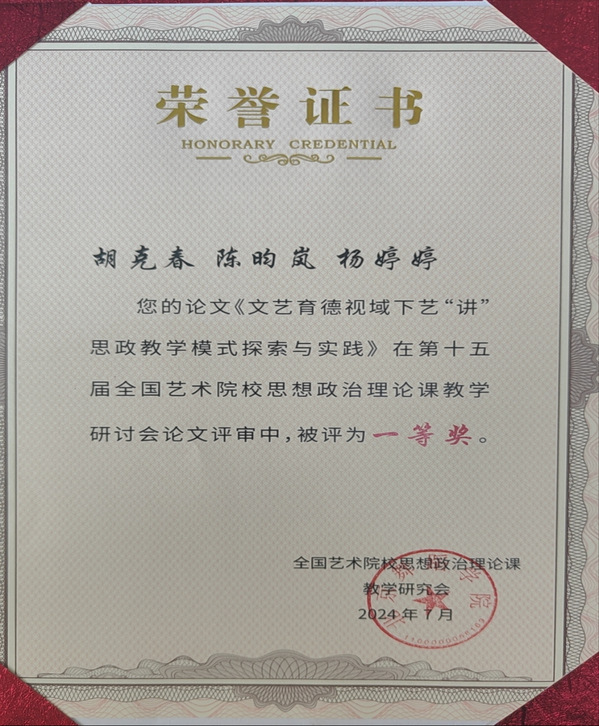 7月17日至18日,第十五届全国艺术院校思想政治理论课教学研讨会暨学习贯彻习近平文化思想集体备课会在北京召开,我校马克思主义学院教师胡克春、陈昀岚、杨婷婷提交的论文《文艺育德视域下艺“讲”思政教学模式探索与实践》获一等奖。