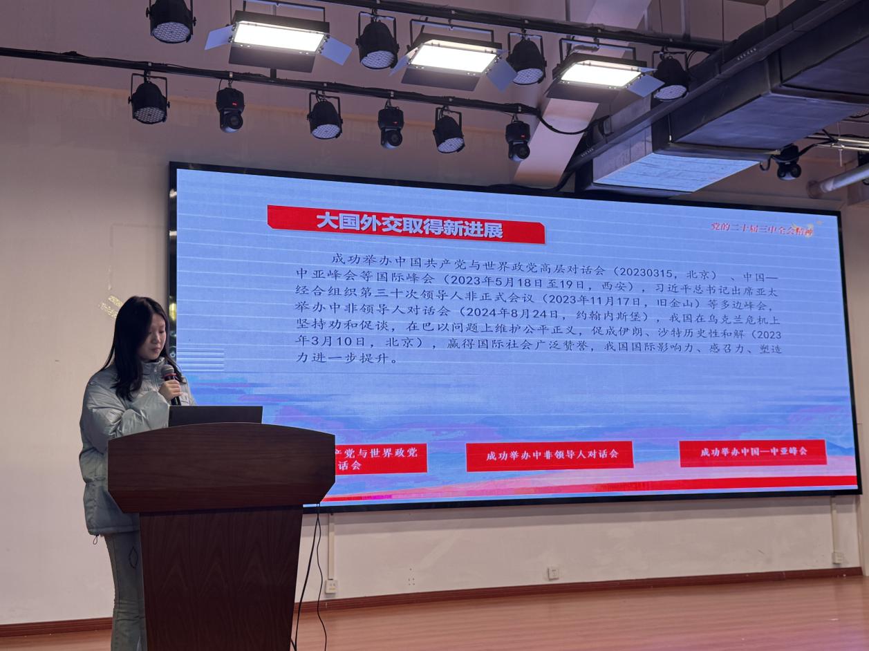 宣讲会上,赵子玉紧紧围绕学习贯彻党的二十届三中全会精神,结合习近平总书记考察安徽重要讲话精神作专题宣讲,深入分析了进一步全面深化改革、推进中国式现代化这一主题。她表示,习近平总书记在桐城六尺巷考察时强调,要加强历史文化保护,坚持创造性转化、创新性发展,在发展社会主义先进文化、弘扬革命文化、传承中华优秀传统文化上协同发力,打牢社会治理的文化根基。同学们要充分认识党的二十届三中全会精神的重大意义,做中华优秀传统文化的弘扬者和践行者,为建设现代化美好安徽挺膺担当。