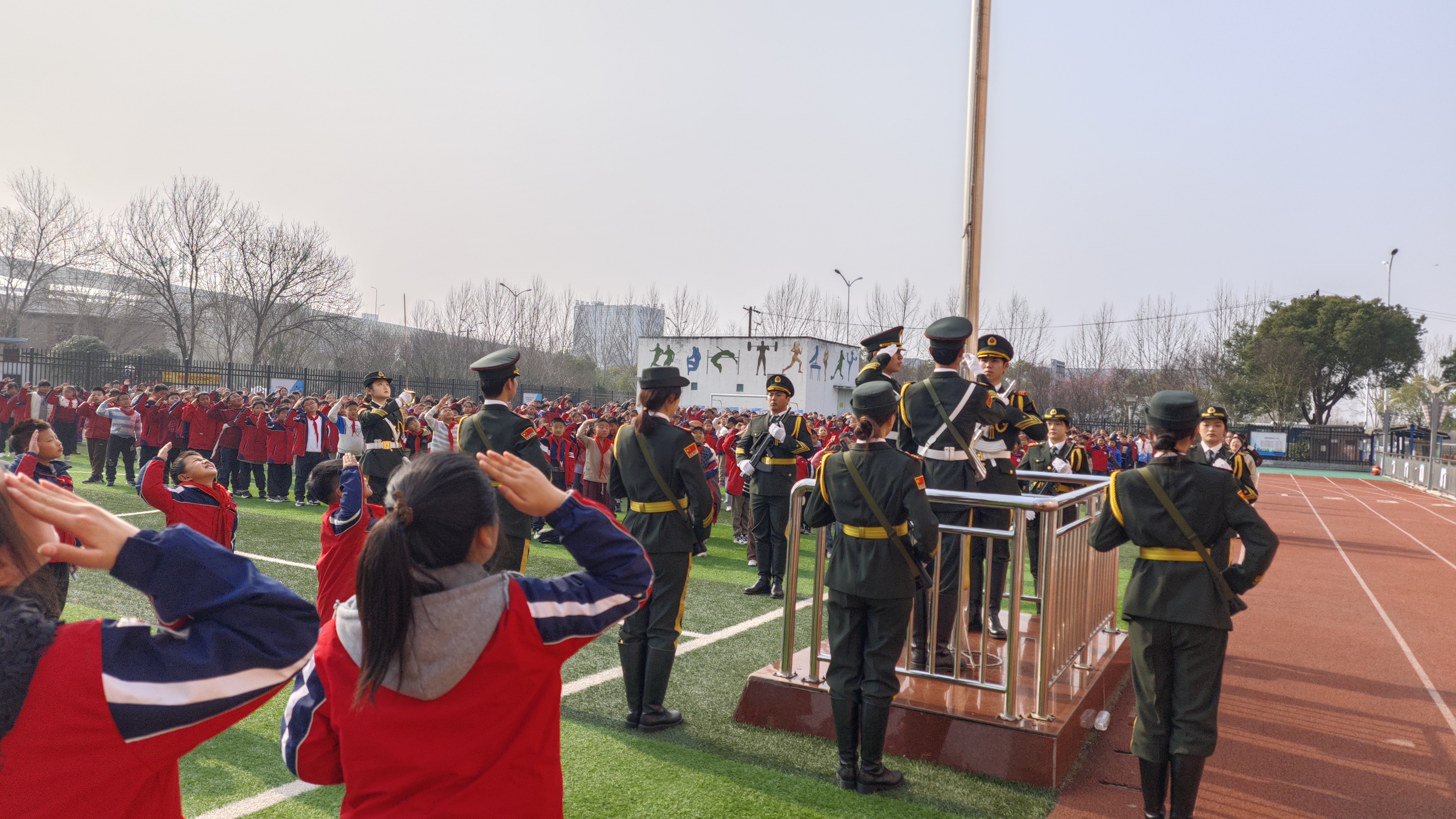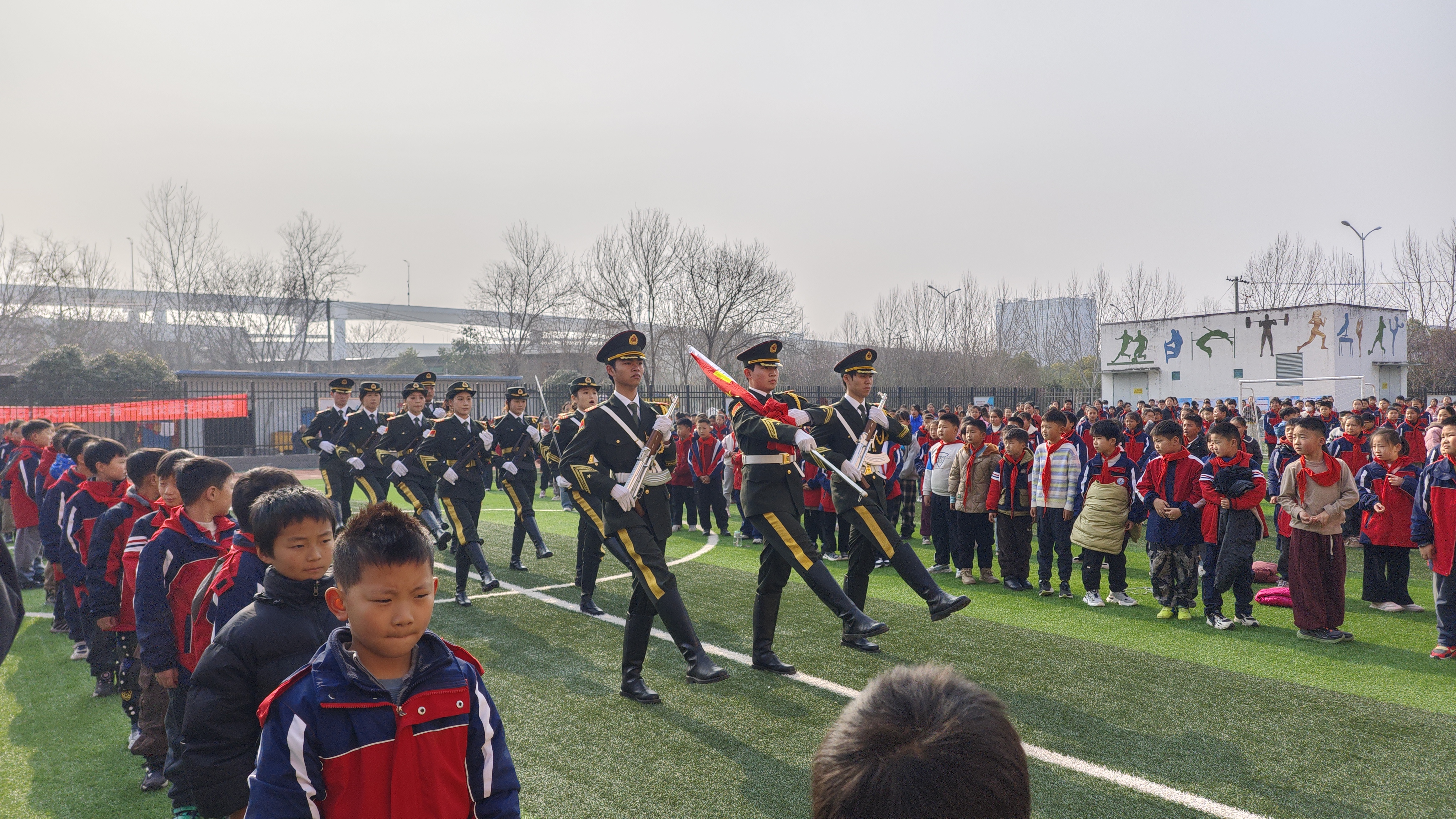 升旗仪式上,国旗护卫队队员身着礼服,擎旗向前,手持礼宾枪,步伐铿锵行进至升旗台前,伴随着《义勇军进行曲》雄壮的旋律,五星红旗缓缓升起,师生行注目礼,少先队员们行队礼。