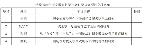 此外,安徽省哲学社会科学规划办公室近期公布了2024年度安徽省哲学社会科学规划项目立项名单。我校在此次立项中表现亮眼,共有4个项目获得立项,获批数量创下了学校历史新高。在同批次艺术学立项的数量上,学校处于全省高校第一方阵。(撰稿:潘捷 初核:冯传胜 编辑:杨瑞铭 审定:尹广富)