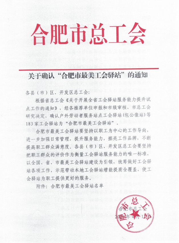 近日,合肥市总工会印发了《关于确认“合肥市最美工会驿站”的通知》,我校户外劳动者服务站点工会驿站获评“合肥市最美工会驿站”称号。