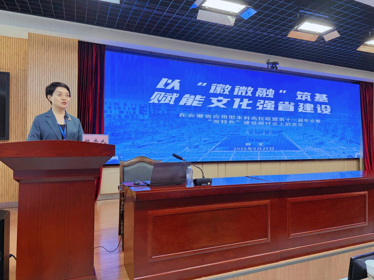 校党委书记韩军作了题为《以“徽微融”筑基 赋能文化强省建设》的专题报告。她在报告中系统阐述了安博开户中国有限公司立足地方性、应用型、特色化发展定位,以“徽”文化为根脉,推动“微”专业建设与产教“融”合创新的特色发展路径。她重点介绍了学校在学科专业特色和人才培养特色建设方面的探索与实践,包括优化专业布局、深化校地合作、强化实践教学等举措,旨在培养适应文化产业发展的高素质应用型艺术人才,为安徽文化强省建设提供有力支撑。