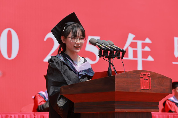美术学院2021级绘画专业的钱逸昕同学作为毕业生代表进行发言,深情讲述了自己在校学习期间的收获与感悟,并对学校的培养、老师们的指导表示感谢。