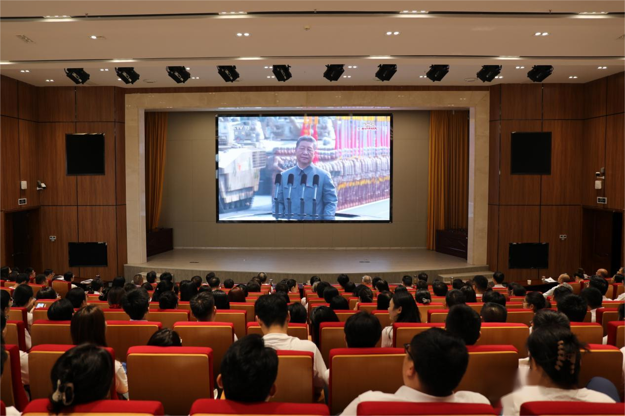9月3日上午,纪念中国人民抗日战争暨世界反法西斯战争胜利80周年大会在北京天安门广场隆重举行,中共中央总书记、国家主席、中央军委主席习近平发表重要讲话并检阅受阅部队。校党委班子全体成员、各部门各教学单位负责人和教职员工在崇德楼五楼报告厅集中收看大会实况,深入学习习近平总书记重要讲话精神,共同见证庄严时刻,铭记历史、缅怀先烈,珍爱和平、开创未来。