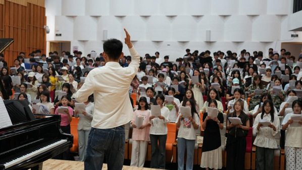 与此同时,203位2025级音乐学院新生也没有闲着,他们组成的合唱团在军训后,最享受的就是练唱学校原创的青春之歌——《艺心向阳》。