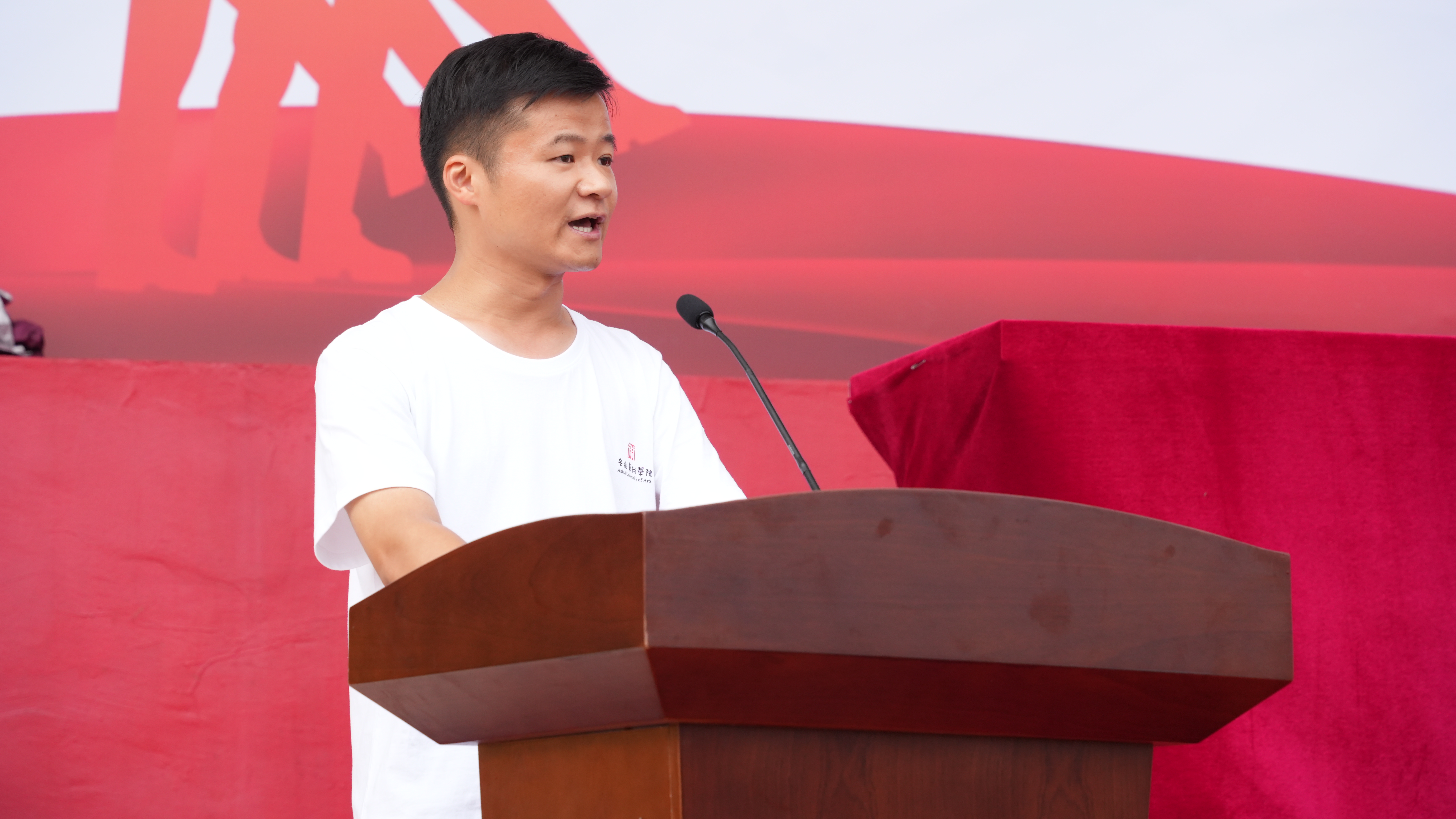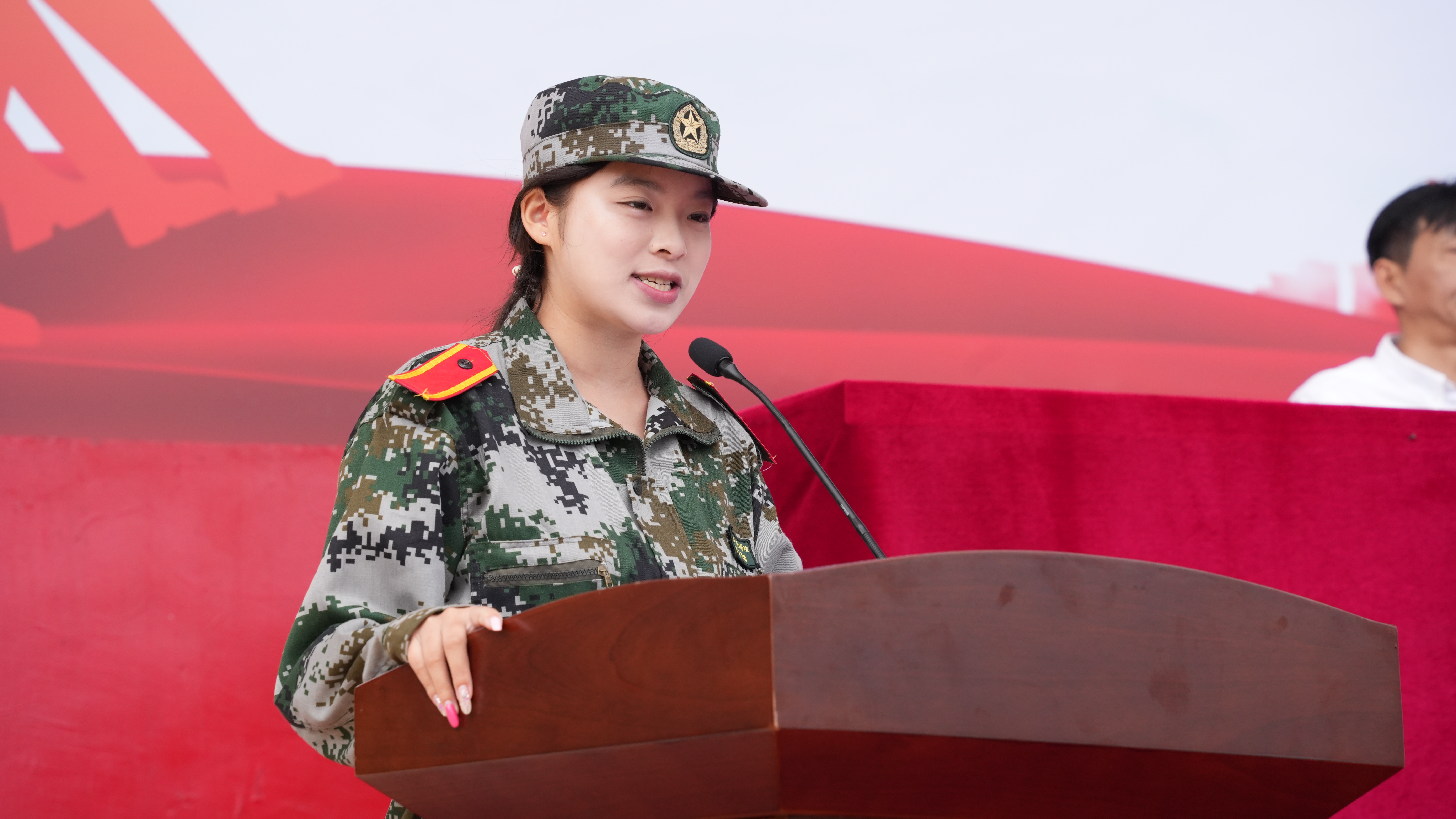 设计学院黄威老师、音乐学院2025级声乐专业欧阳天韵同学,分别代表军训优秀指导员、军训优秀学员讲话。