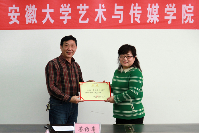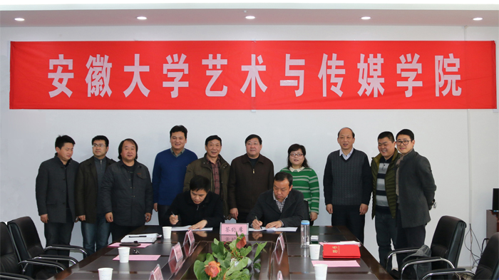 新年的第一个工作日,2016年元月4日上午,安徽大学艺术与传媒学院与安徽省文化馆产、学、研合作协议签约仪式在第一会议室举行。学院党委书记、院长周之虎教授,安徽省文化馆馆长李晓东女士出席会议并致辞。副院长张晶教授,组织人事处、教务处、传媒系等部门负责同志参加了会议。学院教务处处长、科研处处长韩大国教授和省文化馆一级美术师、美术摄影部副主任王永敬分别代表双方在合作协议上签字。传媒系副主任罗耀东教授主持仪式。
