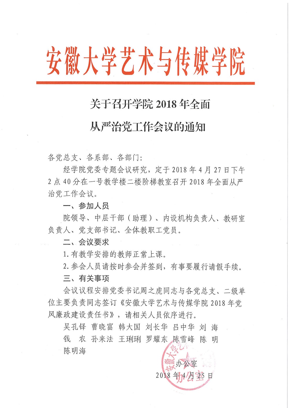 关于召开学院2018年全面从严治党工作会议的通知