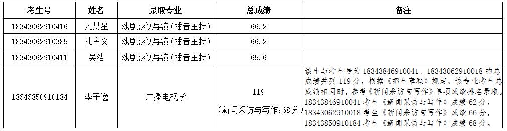 因考生号18343062910068、18343062910066、18343062910404、18343062910144等四位拟录取考生同时被其他院校录取,自愿放弃我院拟录取资格。根据《安徽大学艺术与传媒学院2018年普通专升本招生章程》的录取规则及要求,我院在报考本专业其余参加考试的合格考生中依序递补录取,直至完成该专业招生计划。现将各专业递补录取名单进行公示,公示期限为2018年5月29日—5月31日。具体各专业递补录取名单如下: