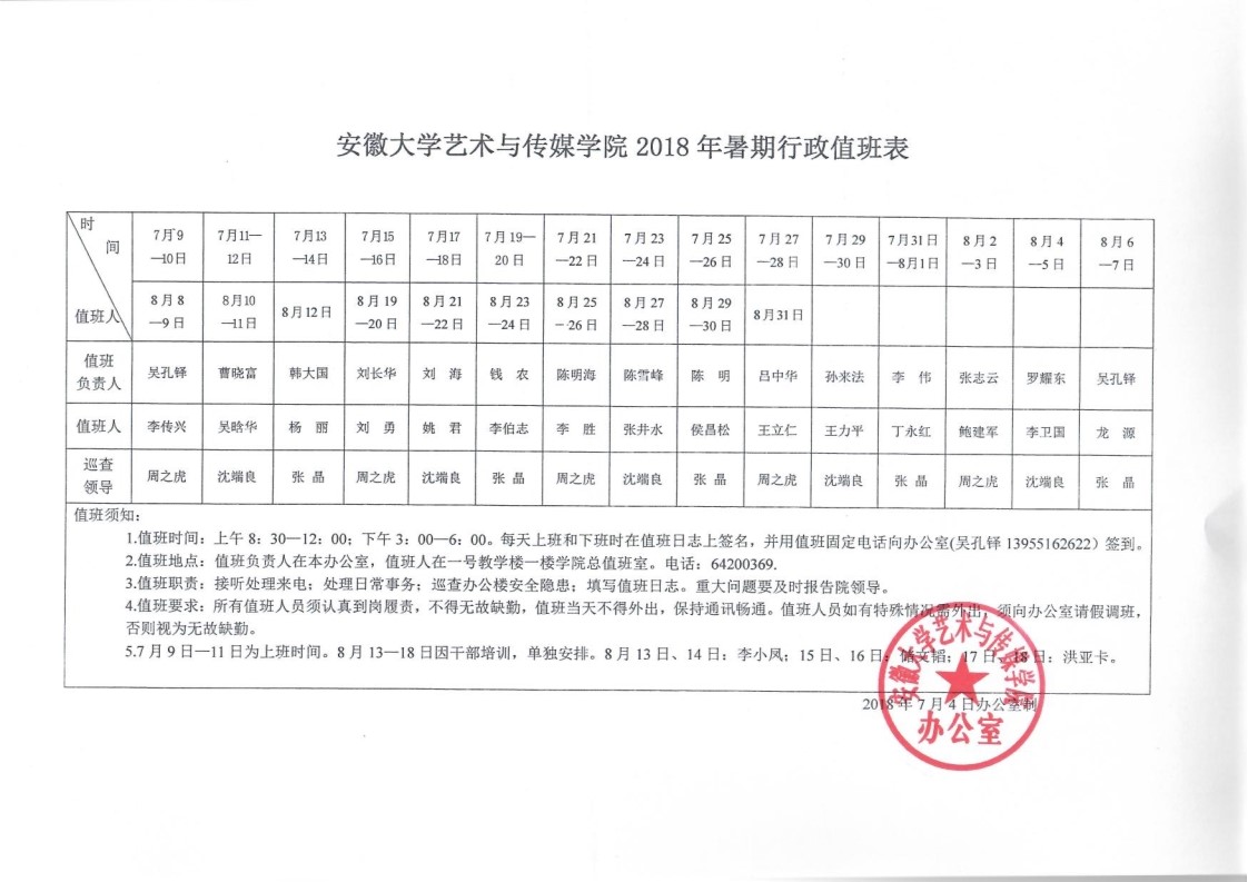 安徽大学艺术与传媒学院2018年暑期行政值班表