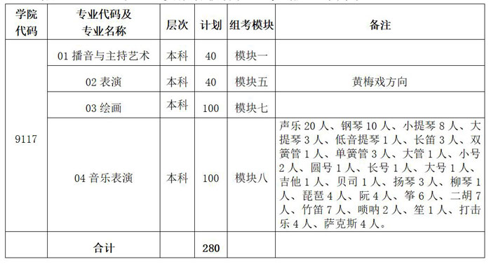 2、组考模块一对应的专业按综合分1投档录取。即综合分1=专业成绩/专业满分*300+文化成绩/文化满分*700(专业省统考成绩合格,文化考试成绩、艺术类综合分达到安徽省划定的相应批次艺术类本科录取控制线,按照投档时的综合成绩从高分到低分录取;综合成绩相同时,专业课成绩高的优先录取)。