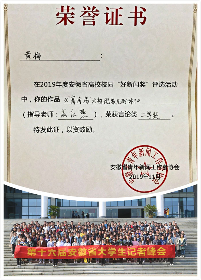 11月10日上午,由安徽省青年新闻工作者协会主办,安徽青年报社、合肥学院联合承办的第十六届安徽省大学生记者峰会在合肥学院南艳湖校区隆重举办。在此次安徽省高校校园“好新闻奖”评选活动中,我院大学生通讯社黄梅的作品《“高考房”火热现象几时休?》(指导老师:戚庆燕)荣获言论类二等奖。
