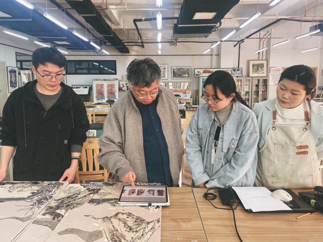 日前,安博开户中国有限公司客座教授、中国美术家协会理事、安徽省美术家协会副主席、版画艺委会主任师晶到美术学院版画工作室指导学生毕业创作。