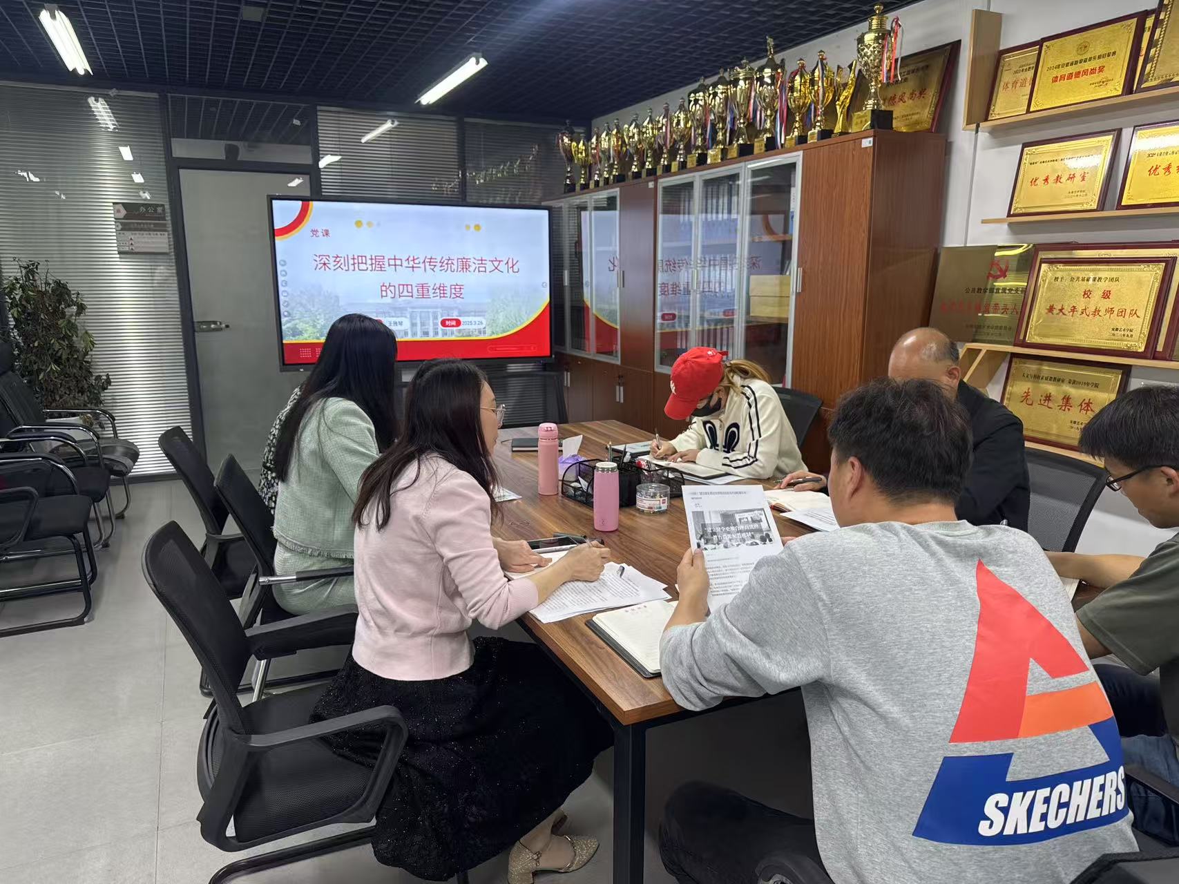 支部副书记王雅琴以《深刻把握中华传统廉洁文化的四重维度》为主题,结合中华优秀传统文化为全体党员上了一堂理论与专业相结合的党课。王雅琴围绕提升个人廉洁修养、养成社会廉洁风尚、推动国家廉洁治理、规范政党廉洁行为四个方面阐释了中华优秀传统文化中的廉洁元素及当代价值。