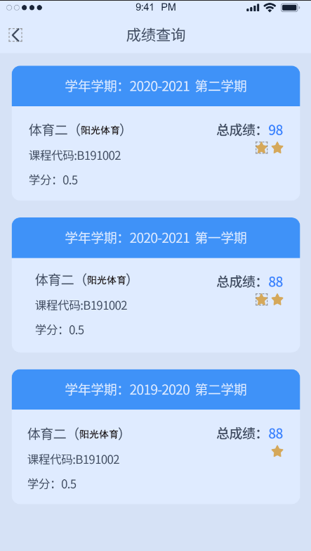 7、我的成绩:学期末课外锻炼截至日后即可在云运动APP查询课外锻炼成绩。在云运动APP首页有个“我的成绩”按钮 点击进入即可查询到该学期的成绩以及往年的课外锻炼成绩如图以下: