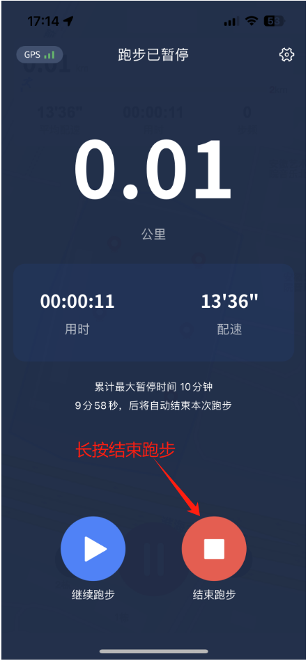 5、结束运动:点击“暂停”按钮,进入到如下界面,长按“结束”,会弹出“结束运动”,点击“结束运动”即可结束本次跑步,如图所示: