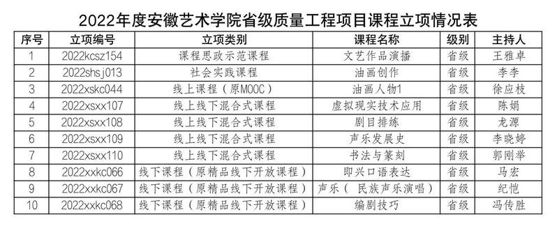 本次学校获批省级质量工程课程项目共计10项,涵盖课程思政示范课程、社会实践课程、线上课程(原MOOC)、线上线下混合式课程、线下课程(原精品线下开放课程)等类别。