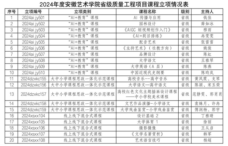 近日,安徽省教育厅公布了2024年度高等学校质量工程项目名单。