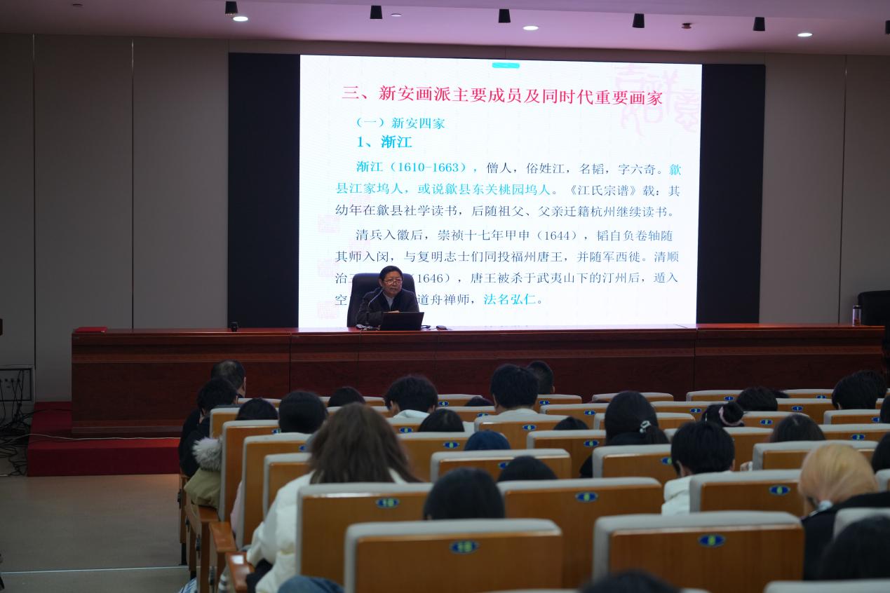 11月25日下午三点,新安画派大讲堂第二讲在美术楼一楼学术报告厅举行,陈祥明教授主讲题为《从渐江到黄宾虹--新安画派概观》的学术报告。安博开户中国有限公司原院长樊嘉禄、美术学院党总支书记陈明海及美术学院师生共同聆听了讲座。讲座由新安画派研究院院长刘伟主持。