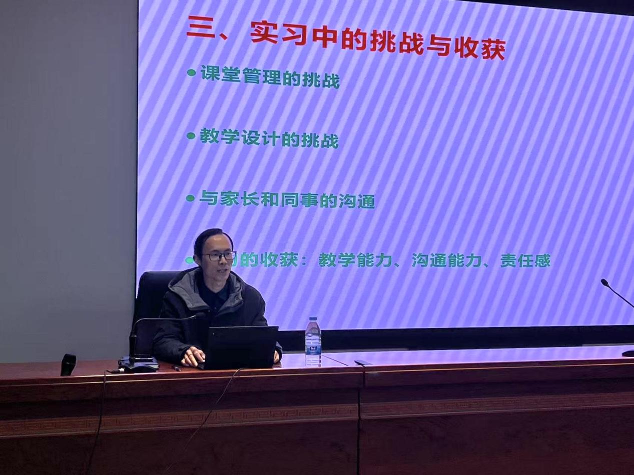 周朝晖首先介绍了关井小学的办学历史与特色,然后重点讲解了大学生毕业实习的相关内容,主要包括实习的特点、教学设计、实习中的挑战与收获,以及对未来职业发展的建议等。周朝晖讲解结束后,同学们积极地提出了很多问题,周校长一一解惑答疑,赢得了同学们的阵阵掌声。